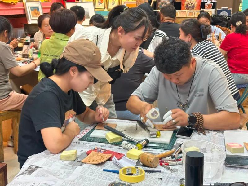 連日來(lái),皮雕技藝培訓(xùn)班也在如火如荼開展。自治區(qū)級(jí)非遺項(xiàng)目皮雕技藝傳承人溫都爾木現(xiàn)場(chǎng)指導(dǎo)學(xué)員制作傳統(tǒng)皮雕,并將皮雕技藝創(chuàng)新應(yīng)用于錢包、腰帶等日常用品?!按舜闻嘤?xùn)吸引了30多名農(nóng)牧民參與,我們不僅傳授傳統(tǒng)皮雕工藝,還教授阿拉善寶石鑲嵌技法,助力農(nóng)牧民掌握增收新技能,實(shí)現(xiàn)技藝傳承與增收致富雙贏。”溫都爾木告訴記者。