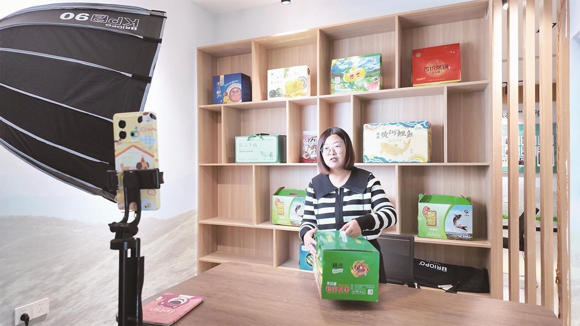 返鄉(xiāng)創(chuàng)業(yè)的“95后”青年王亞春在直播間帶貨助農。