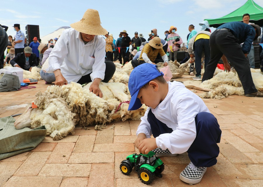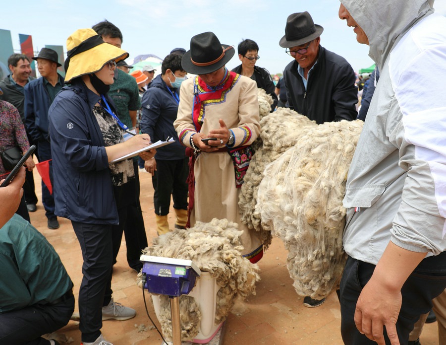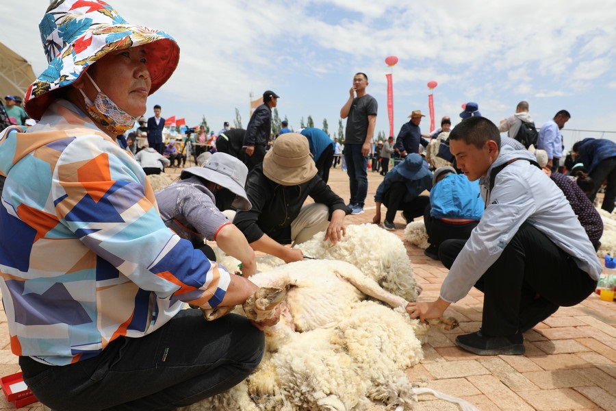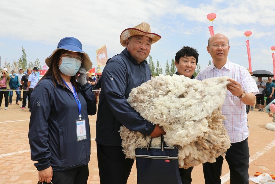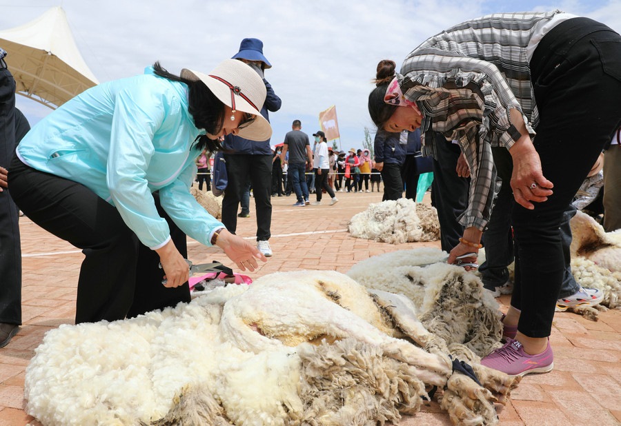 在同步舉行的剪羊毛大賽中,參賽選手們用剪刀和電動剪毛機,在細毛羊身上翻飛操作,牧民們熟練的身手和精湛的技藝,使一只只羊片刻之間“脫胎換骨”。