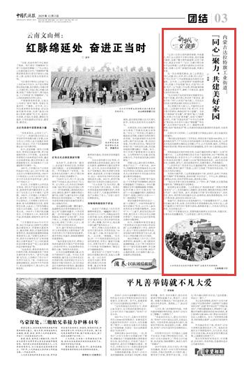 2025年12月2日,《中國民族報》第3版刊發(fā)題為《內蒙古達拉特旗工業(yè)街道:“同心”聚力,共建美好家園》的文章,報道了內蒙古達拉特旗工業(yè)街道以“同心共建、同心共學、同心共事、同心共樂”的“四心四共”工作法賦能基層治理。打造“同心向暖·花開工業(yè)”民族工作品牌,將民族團結融入基層治理各環(huán)節(jié),奏響了開放包容、融榮共居的和諧樂章。