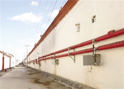 在臺(tái)閣牧鎮(zhèn)沙家營(yíng)村,記者看到供熱管網(wǎng)改造施工時(shí)開挖的街巷已完成路面硬化;換熱站內(nèi)運(yùn)轉(zhuǎn)的機(jī)器隆隆作響,輸送熱源的管道摸起來十分燙手;在成排的居民房屋后墻整齊地安裝了包裹保溫材料的供熱管道和計(jì)量表箱,暖氣經(jīng)由這些管道輸送到各家各戶。