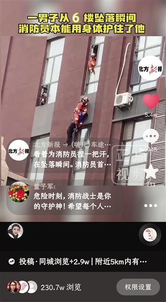 6月25日12時(shí)10分,呼和浩特市彩虹城發(fā)生驚險(xiǎn)一幕:一男子欲跳樓輕生,墜落瞬間,一名消防員飛身拽住了他,本能地用身體將其牢牢護(hù)在懷中,最終,該男子成功獲救。救援的這一幕被熱心市民朱先生用手機(jī)記錄下來并發(fā)布到網(wǎng)上,瞬間引來各地網(wǎng)友圍觀。本報(bào)官方抖音賬號(hào)也發(fā)布了這則視頻,播放量突破230萬,點(diǎn)贊5.4萬。