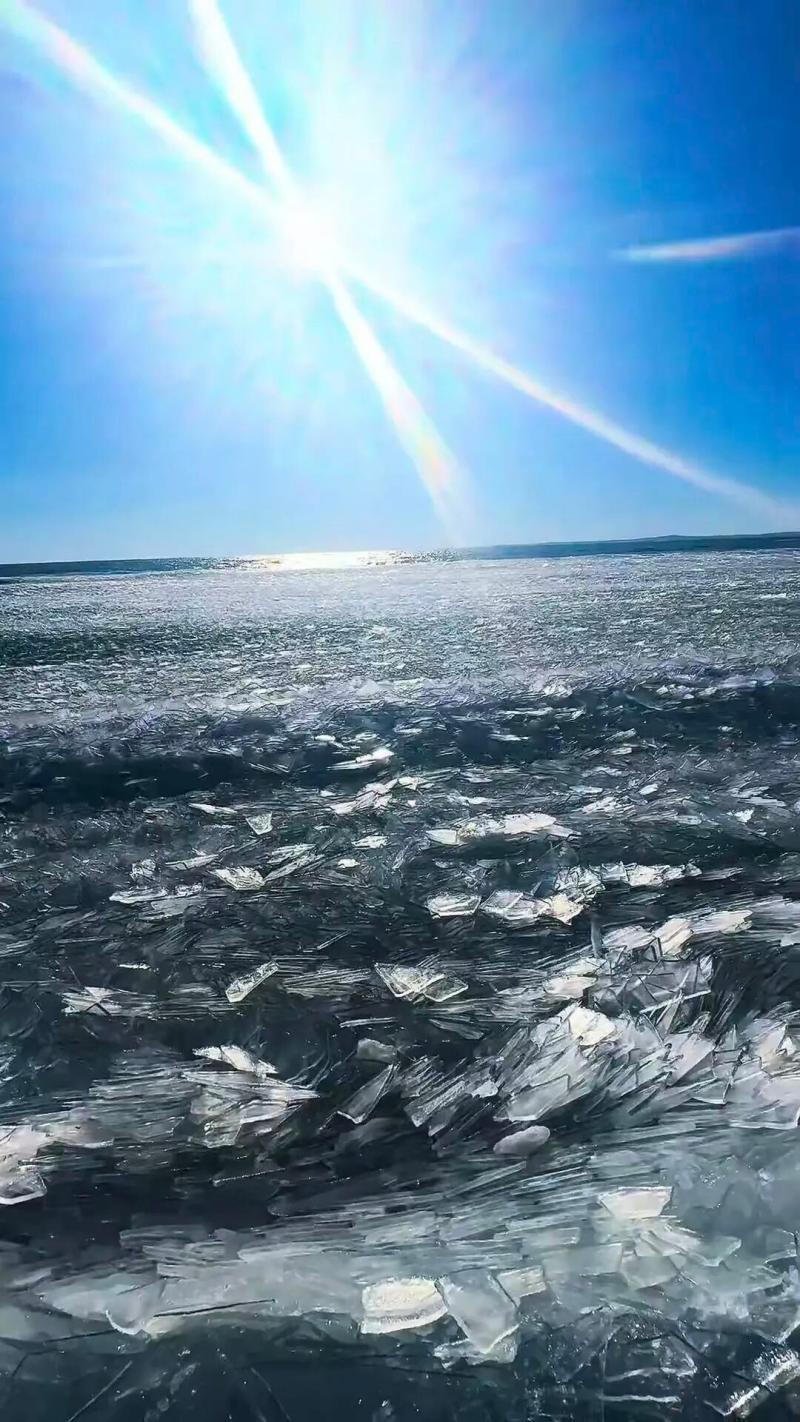在無人機(jī)航拍視角下,2239.9平方公里的湖面上,冰排與未完全封凍的水域交織分布,白色冰體與湛藍(lán)湖水相映,宛如大地鋪展的巨型碧玉上鑲嵌的銀紋。靠近湖中心的區(qū)域,新凍結(jié)的冰層還呈現(xiàn)出細(xì)膩的冰花紋路,而岸邊的冰排群中,隱約可見因地下泉眼涌動形成的“清眼”,表面覆著薄霜,在陽光下泛著微光。