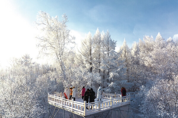 冬天的阿爾山,千里冰封,萬里雪飄,呈現(xiàn)出一片純凈無瑕的白雪世界。晶瑩剔透的霧凇裝點其間,宛如冰雪童話。藍天映襯下,霧凇閃耀著銀白光芒,群山峻嶺被冰封玉塑,更有一道彩虹橫跨山巔,美不勝收。木棧道深入森林,所見皆是雪與霧凇交織的白茫茫景象。漫步其間,穿越過膝積雪,那玉樹瓊花、銀光閃爍的壯美雪景讓人流連忘返。 (記者 畢力格 攝)