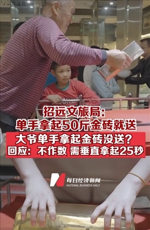 ·山東煙臺招遠文旅局:單手拿起50斤金磚就送!大爺單手舉起50斤金磚沒拿走?回應:不作數(shù),需垂直拿起25秒。