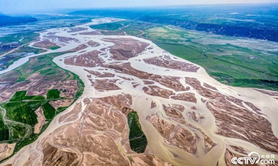 隨著黃河水位下降,山西運城萬榮縣境內的黃河河床大面積裸露,河水在主河道上分散成了無數(shù)條大小不等的細流,形成了黃河特有的景色。