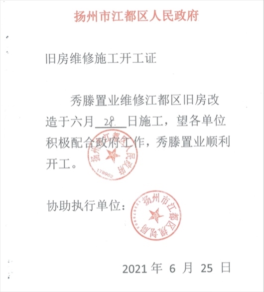 “搞定”西苑社區(qū)后,楊某軍偽造一份《揚州市江都區(qū)人民政府舊房維修施工開工證》,并加蓋“揚州市江都區(qū)人民政府 178962”“揚州市江都區(qū)規(guī)劃局”公章。周女士獲得該證后,立即組織顧先生進場施工?!皸钅耻娮屛蚁葔|付材料款和人工費,后面等財政撥款就行。我就安排顧先生7月1日進場施工。”