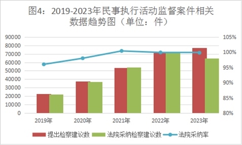 2023年,全國檢察機關(guān)共受理民事審判活動監(jiān)督案件6.94萬件,同期審結(jié)6.96萬件(含積存)。提出檢察建議6.47萬件,同比上升5.1%,占審結(jié)案件數(shù)的93%,同比增加4.2個百分點。對提出的檢察建議,法院同期采納6.46萬件,檢察建議采納率達99%。一些地區(qū)通過開展專項監(jiān)督,加強辦案力度,提高辦案效果,推動民事審判活動監(jiān)督向深層次違法監(jiān)督轉(zhuǎn)變。