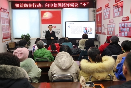 吉林省吉林市船營區(qū)人民法院在向陽街道北安社區(qū)開展“向電信網絡詐騙說‘不’”普法講座。