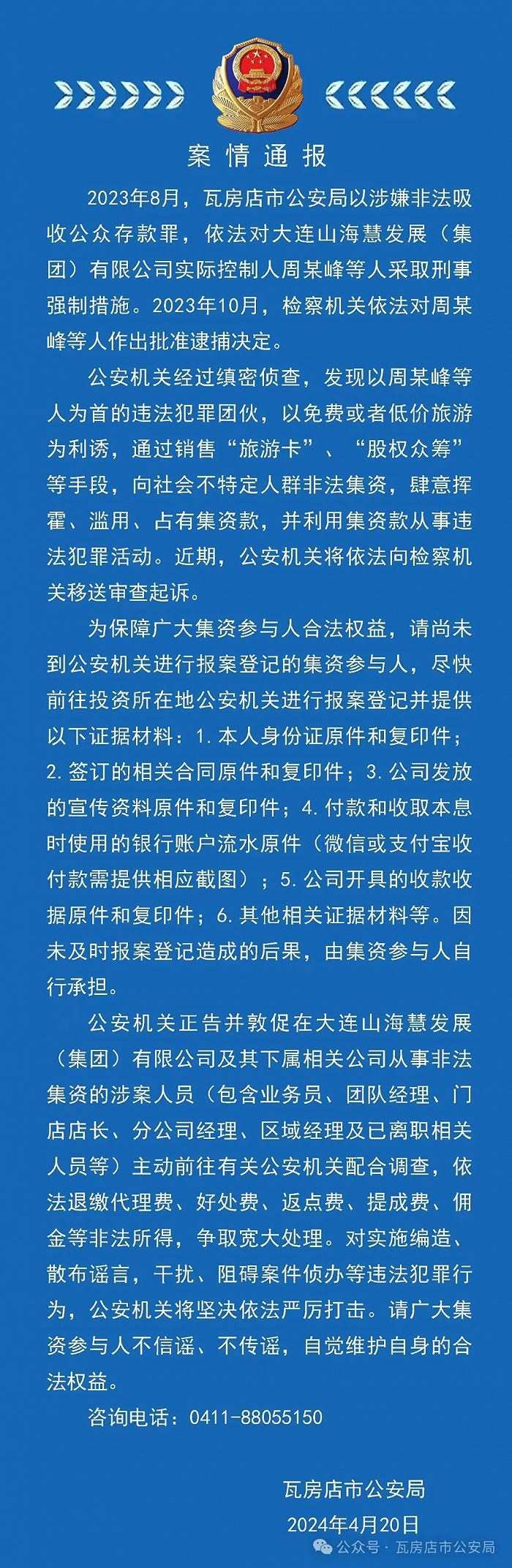 央視網(wǎng)消息:據(jù)瓦房店市公安局官微消息,遼寧瓦房店市公安局通報,2023年8月,瓦房店市公安局以涉嫌非法吸收公眾存款罪,依法對大連山海慧發(fā)展(集團)有限公司實際控制人周某峰等人采取刑事強制措施。2023年10月,檢察機關(guān)依法對周某峰等人作出批準逮捕決定。公安機關(guān)經(jīng)過縝密偵查,發(fā)現(xiàn)以周某峰等人為首的違法犯罪團伙,以免費或者低價旅游為利誘,通過銷售“旅游卡”、“股權(quán)眾籌”等手段,向社會不特定人群非法集資,肆意揮霍、濫用、占有集資款,并利用集資款從事違法犯罪活動。近期,公安機關(guān)將依法向檢察機關(guān)移送審查起訴。