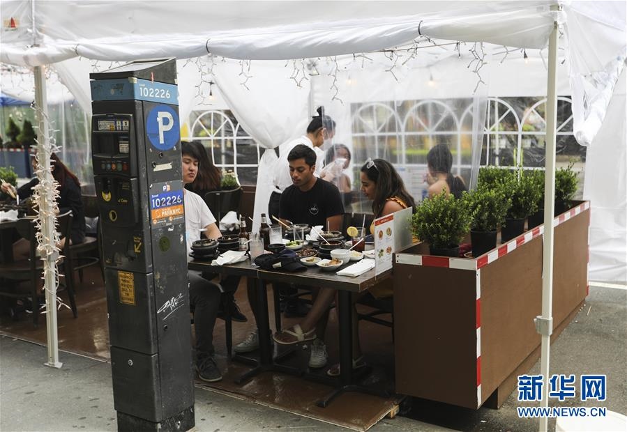 7月23日,在美國紐約,人們在戶外就餐區(qū)用餐。美國約翰斯·霍普金斯大學(xué)23日發(fā)布的新冠疫情最新統(tǒng)計數(shù)據(jù)顯示,美國累計確診病例超過400萬例。數(shù)據(jù)顯示,截至美國東部時間23日15時34分(北京時間24日3時34分),美國累計確診病例4007859例,累計死亡病例143846例。新華社記者王迎攝