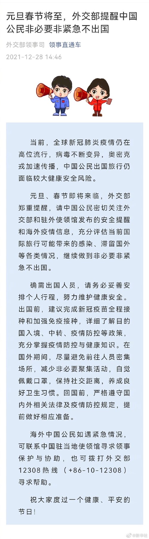 元旦、春節(jié)即將來(lái)臨,外交部鄭重提醒,請(qǐng)中國(guó)公民密切關(guān)注外交部和駐外使領(lǐng)館發(fā)布的安全提醒和海外疫情信息,充分評(píng)估當(dāng)前國(guó)際旅行可能帶來(lái)的感染、滯留國(guó)外等各類(lèi)情況,繼續(xù)做到非必要非緊急不出國(guó)。