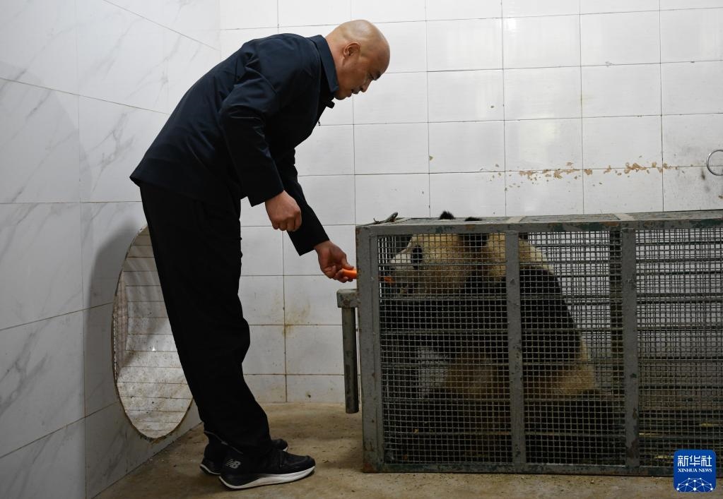 10月18日,在中國大熊貓保護(hù)研究中心雅安基地,飼養(yǎng)師董禮用胡蘿卜安撫進(jìn)入轉(zhuǎn)運(yùn)籠的大熊貓“四?!?。新華社記者 胥冰潔 攝