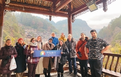 貴州省凱里市的郎德上寨被譽(yù)為“中國景觀村落”,圖為在華外國人到此游覽。 中旅旅行供圖