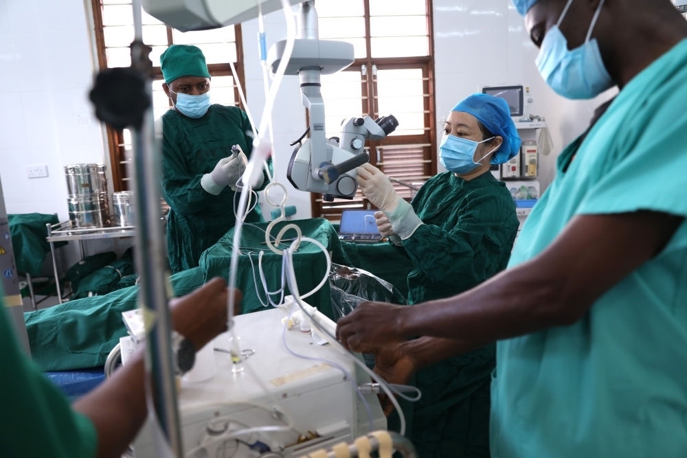 2023年2月23日,在坦桑尼亞桑給巴爾島納茲莫加醫(yī)院,第32期中國援桑給巴爾醫(yī)療隊的眼科醫(yī)生董莉莉(右二)與桑給巴爾同事一起做術(shù)前準(zhǔn)備。新華社記者 董江輝 攝