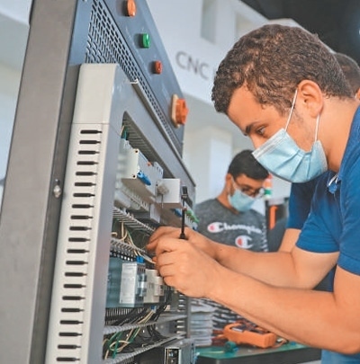 2022年8月16日,在位于埃及首都開羅的艾因夏姆斯大學(xué)魯班工坊,學(xué)生正在學(xué)習(xí)電路連接。 新華社記者 隋先凱攝