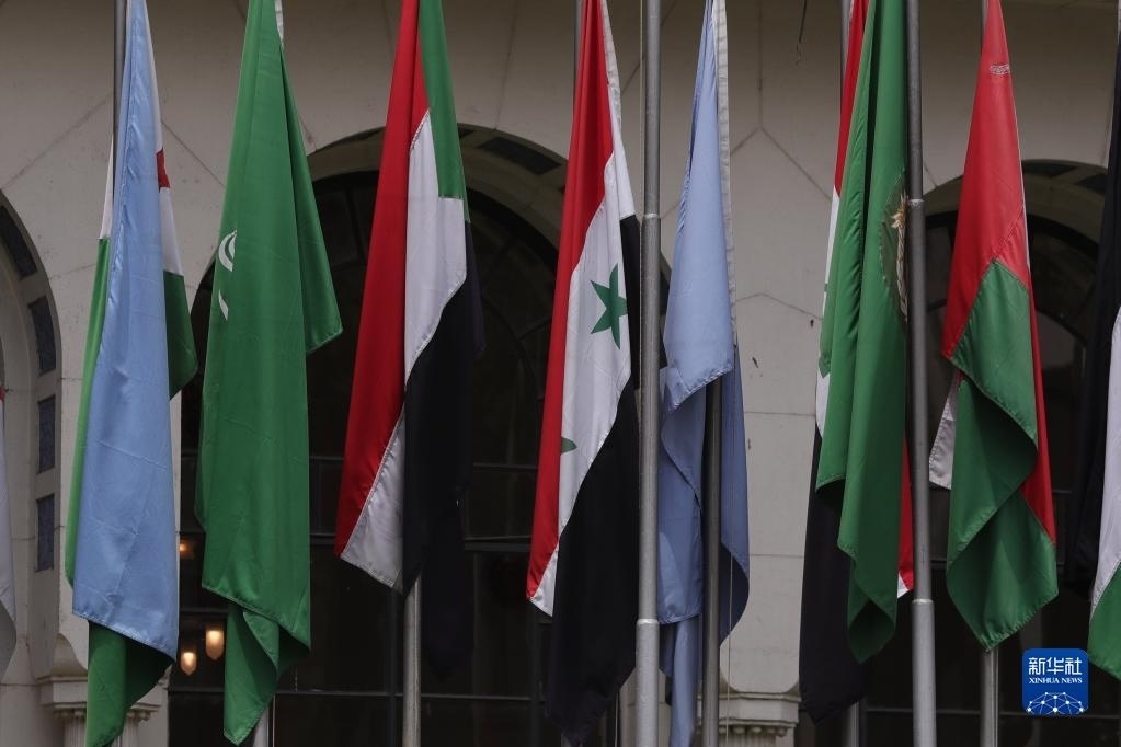 這是5月7日在位于埃及開羅的阿拉伯國家聯(lián)盟總部拍攝的敘利亞國旗(左四)。   新華社發(fā)(艾哈邁德·戈馬 攝)