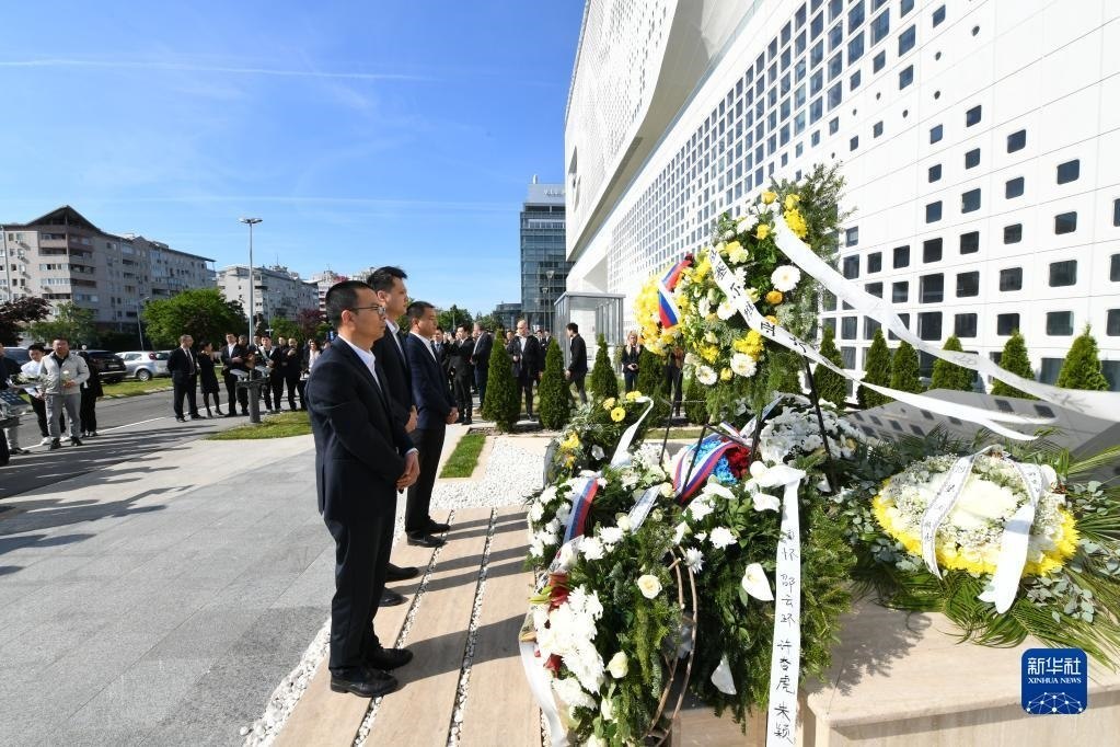 5月7日,在塞爾維亞貝爾格萊德,中資企業(yè)代表在中國駐南斯拉夫聯(lián)盟大使館舊址前的烈士紀(jì)念碑前肅立。