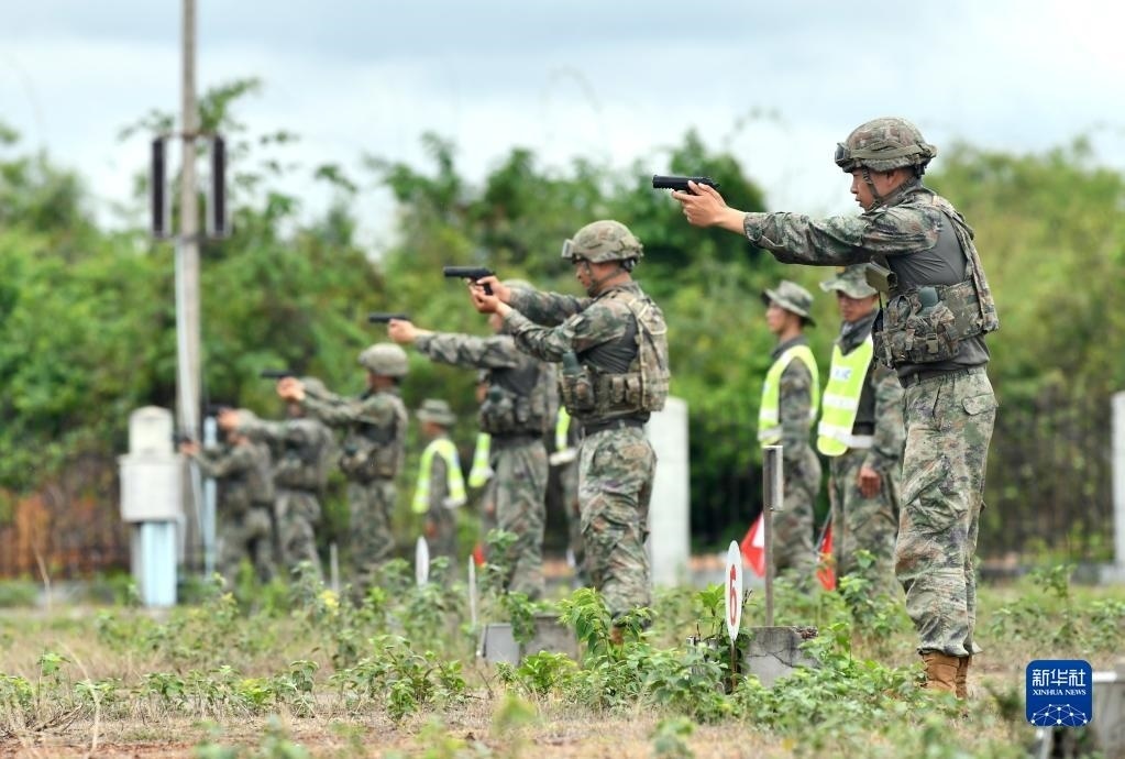 5月13日,在老撾人民軍庫(kù)瑪?shù)W(xué)院訓(xùn)練場(chǎng),中方參演官兵進(jìn)行手槍射擊示范。