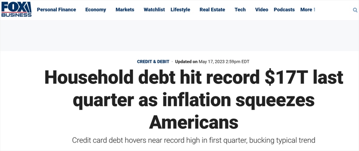 “通脹榨干了美國人,”對此,美國福克斯新聞網(wǎng)報道稱,“自2023年伊始,美國人的債臺更加高筑,有越來越多的美國家庭拖欠貸款。”