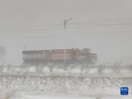 5月20日,在蒙古國(guó)蘇赫巴托爾省,貨車(chē)在暴風(fēng)雪中行駛。新華社發(fā)(蒙古國(guó)蘇赫巴托爾省BBS電視臺(tái)供圖)