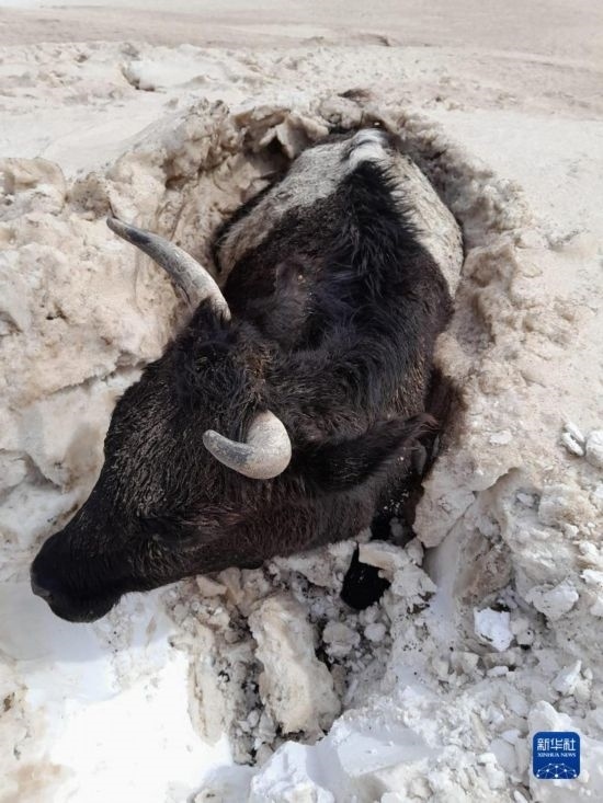 5月20日,在蒙古國(guó)蘇赫巴托爾省,一頭牛被埋在雪堆中。新華社發(fā)(蒙古國(guó)蘇赫巴托爾省BBS電視臺(tái)供圖)