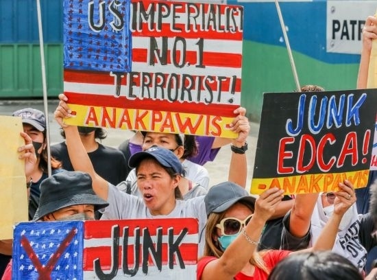 4月11日,在菲律賓首都大馬尼拉地區(qū)奎松城,民眾參加集會(huì)活動(dòng),抗議菲律賓和美國(guó)軍方舉行聯(lián)合軍事演習(xí)。新華社發(fā)(烏馬利攝)