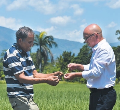 中國(guó)農(nóng)業(yè)專家(右)和當(dāng)?shù)貙<以诙嗝啄峒訃?guó)家水稻培訓(xùn)中心討論水稻種植問(wèn)題。 新華社記者 朱婉君攝