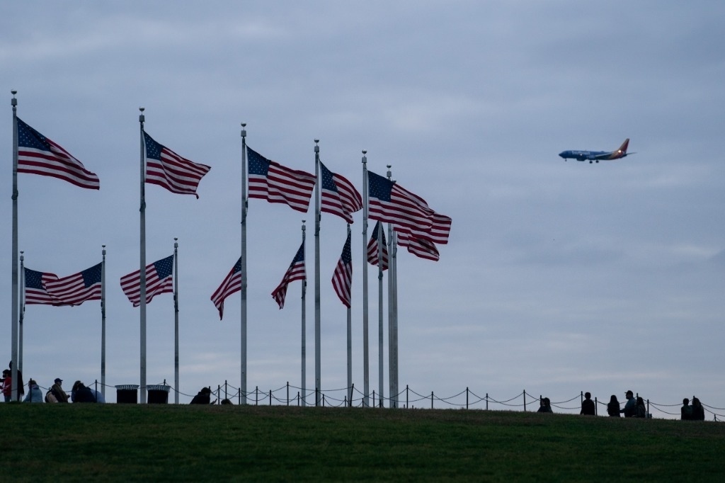 2022年11月10日,在美國(guó)首都華盛頓,一架飛機(jī)從美國(guó)國(guó)旗上空飛過。新華社記者劉杰攝