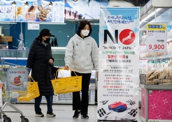 2021年4月14日,韓國首爾的一家農協(xié)連鎖超市的水產商品貨架前打出“抵制日本”、“本店不銷售日本產產品”等標語,對日本政府決定將福島第一核電站核污染水排入大海表示抗議。 新華社發(fā)(徐儒錫攝)