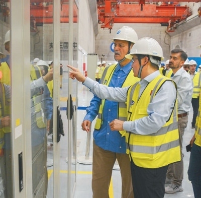 巴基斯坦卡洛特水電站是中巴經(jīng)濟(jì)走廊首個(gè)水電投資項(xiàng)目,由中國三峽集團(tuán)投資開發(fā)建設(shè),運(yùn)營一年來節(jié)約標(biāo)準(zhǔn)煤約140萬噸,減少二氧化碳排放約350萬噸。圖為中方技術(shù)人員向來訪的巴基斯坦代表團(tuán)介紹水電站運(yùn)行情況。本報(bào)巴基斯坦分社 薩義德·邁赫迪攝