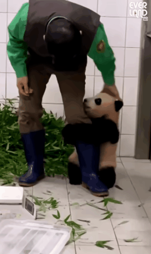 “福寶”抱著飼養(yǎng)員的腿撒嬌。(來源:愛寶樂園官方社交平臺(tái)賬號(hào))