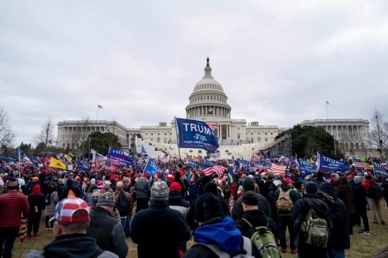 2021年1月6日,在美國首都華盛頓的國會(huì)大廈前,時(shí)任總統(tǒng)特朗普的支持者舉行示威游行。部分示威者沖擊國會(huì)大廈,導(dǎo)致國會(huì)參眾兩院認(rèn)證總統(tǒng)選舉結(jié)果的聯(lián)席會(huì)議中斷數(shù)小時(shí)。事件造成4名示威者和1名國會(huì)警察死亡。新華社記者劉杰攝