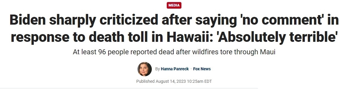 ??怂剐侣劸W(wǎng)8月14日報道稱,當?shù)貢r間13日上午,毛伊島救災(zāi)仍在進行,美國總統(tǒng)拜登卻在其位于特拉華州里霍伯斯海灘的海邊別墅過周末。當被問及毛伊島大火造成的死亡人數(shù)正不斷上升的問題時,拜登表示“不予置評”。