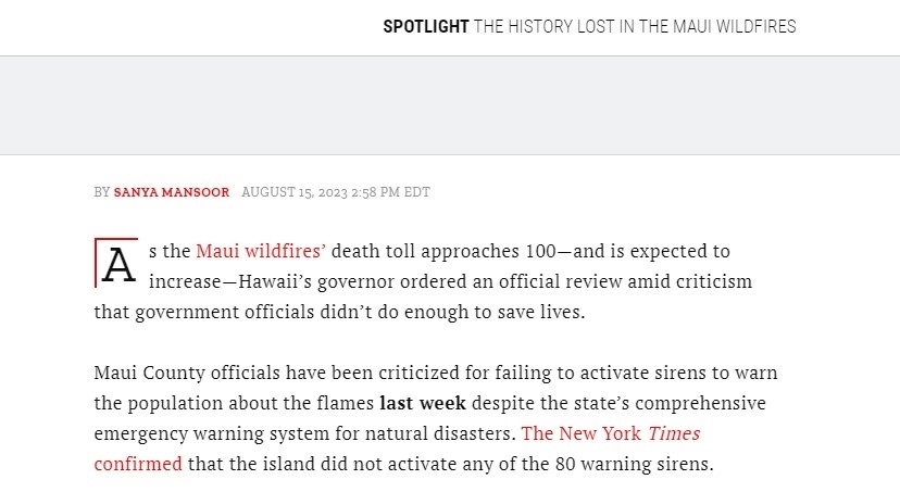 據(jù)悉,夏威夷毛伊島部署有80個警報器,但是在此次野火來襲過程中,警報器并未響起。安達亞16日曾表示,他并不后悔沒有拉響警報器,因為警報器通常是用來警示海嘯的,反而可能導(dǎo)致很多民眾逃向內(nèi)陸地勢較高處,從而進入火海。這一表態(tài)激起了廣泛爭議和批評。
