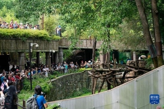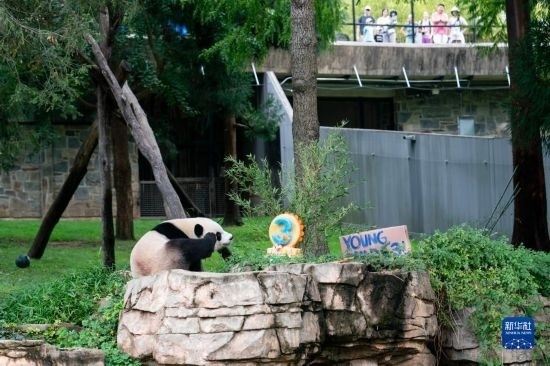 8月21日,游客在美國(guó)首都華盛頓史密森學(xué)會(huì)國(guó)家動(dòng)物園觀看大熊貓幼崽“小奇跡”過生日。新華社記者 劉杰 攝