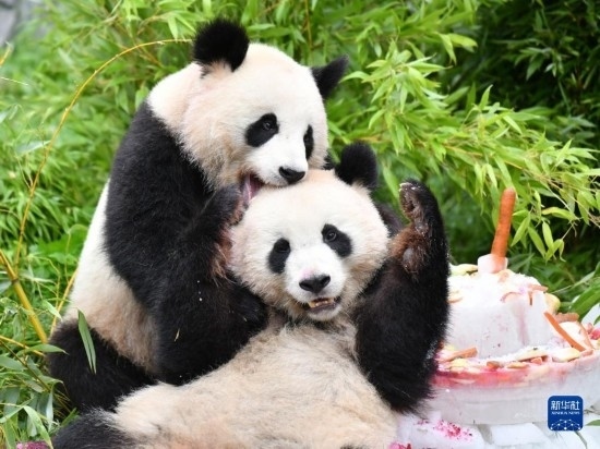 8月31日,大熊貓“夢想”(左)和“夢圓”在德國柏林動物園享用“生日餐”。當(dāng)日,在德國出生的大熊貓雙胞胎兄弟“夢想”和“夢圓”迎來4歲生日,柏林動物園為它們舉辦了慶?;顒?。新華社記者 任鵬飛 攝