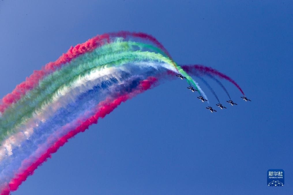 9月2日,在希臘塔納格拉空軍基地的雅典飛行周上,來自意大利的飛行表演隊進行表演。新華社發(fā)(馬里奧斯·羅洛斯攝)