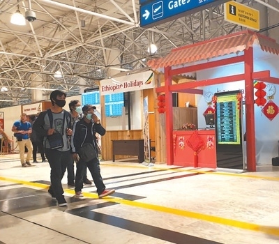 旅客經(jīng)過(guò)埃塞俄比亞博萊國(guó)際機(jī)場(chǎng)內(nèi)的中文服務(wù)臺(tái)。本報(bào)記者 萬(wàn) 宇攝