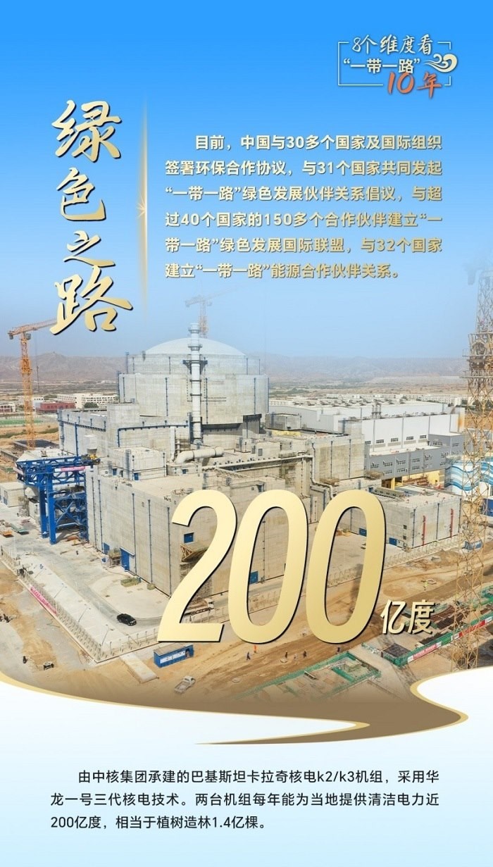 十年來,“綠色絲綢之路”建設取得豐碩成果。中國已與30多個國家及國際組織簽署環(huán)保合作協(xié)議,與31個國家共同發(fā)起“一帶一路”綠色發(fā)展伙伴關系倡議,與32個國家建立“一帶一路”能源合作伙伴關系。