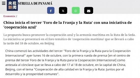 第三屆“一帶一路”國際合作高峰論壇也受到多國主流媒體關(guān)注。巴拿馬歷史最悠久,全國發(fā)行量最大的日報之一《巴拿馬星報》刊發(fā)了主題報道,聚焦高峰論壇發(fā)布的《“一帶一路”藍色合作倡議》,并評論稱這一倡議體現(xiàn)了中國對于高質(zhì)量推進“一帶一路”海洋合作的高度重視。