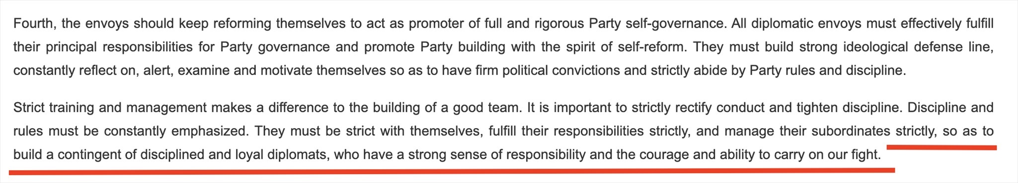 “鐵軍”一詞常見于政府文件或領導人講話,更多的是強調工作作風和紀律。在近年來中國領導人講話中,曾多次出現(xiàn)“紀律監(jiān)察鐵軍”“生態(tài)環(huán)境保護鐵軍”等表述。中國領導人在接見與會使節(jié)時的講話中說:“打造一支對黨忠誠、勇于擔當、敢斗善斗、紀律嚴明的外交鐵軍。”外交部網(wǎng)站對這句話的英文翻譯(見下圖)同樣強調外交隊伍的紀律、責任和勇氣。作為通行做法,世界各國對本國外交人員都有著很高的紀律要求。