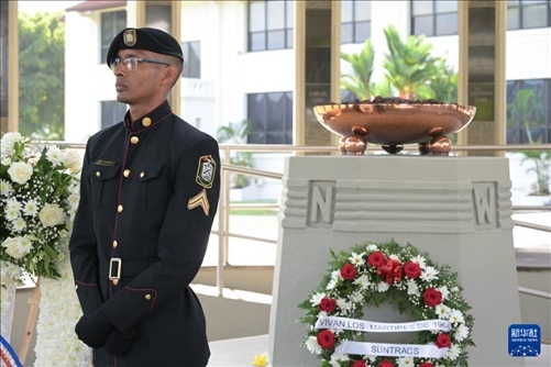 1月9日,在巴拿馬首都巴拿馬城,兩名士兵向紀念“護旗運動”的“永恒之火”紀念碑獻花圈。新華社記者 陳昊佺 攝