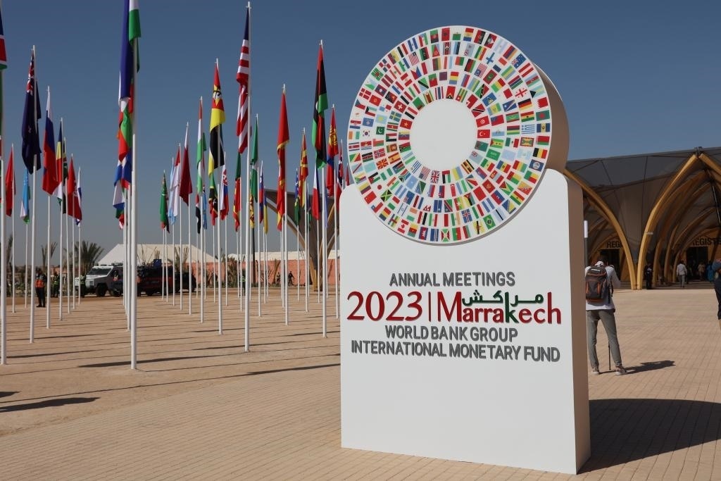 這是2023年10月9日在摩洛哥馬拉喀什拍攝的國際貨幣基金組織(IMF)和世界銀行年會標志。新華社記者霍晶攝