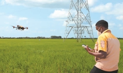 在烏干達(dá)卡隆古區(qū)盧卡亞鎮(zhèn)中億農(nóng)業(yè)園,作業(yè)員赫伯特·阿加巴操控植保無人機(jī)噴灑農(nóng)藥。新華社記者 張改萍攝