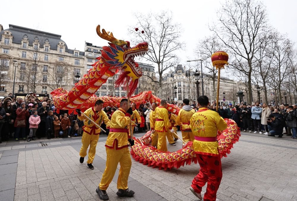 2月4日,人們?cè)诜▏?guó)巴黎香榭麗舍大街觀看舞龍舞獅表演。新華社記者 高靜 攝