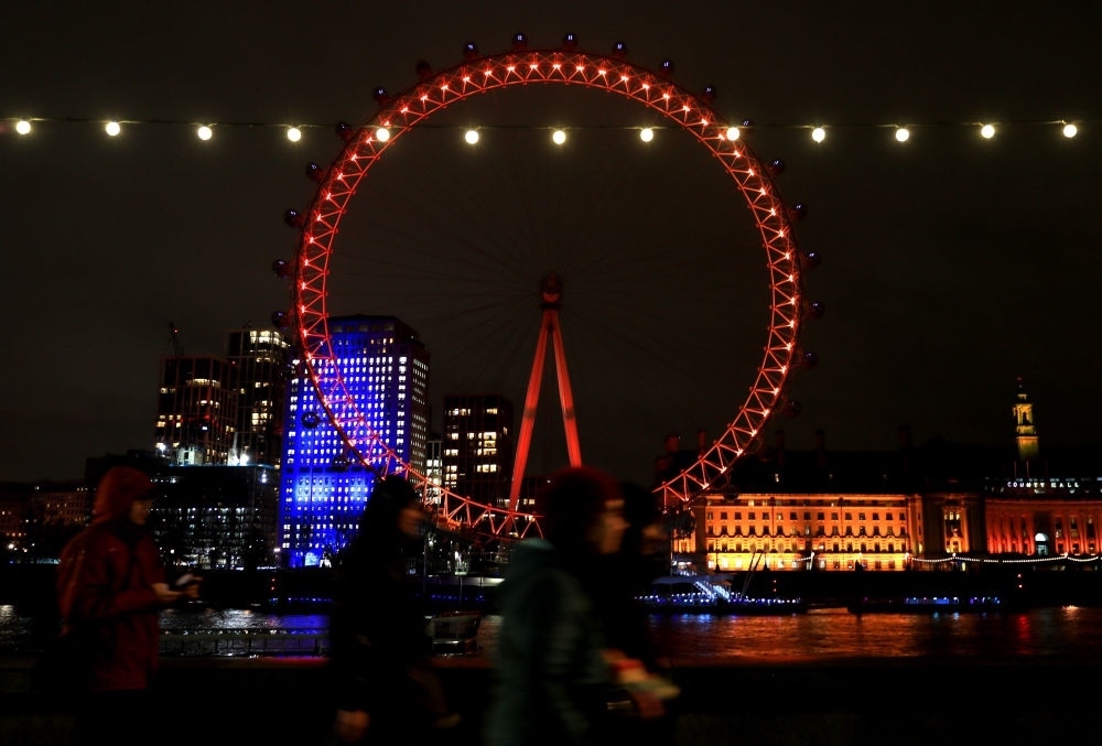 2月8日,在英國(guó)倫敦,行人走過亮起紅色燈光的“倫敦眼”。新華社記者 李穎 攝