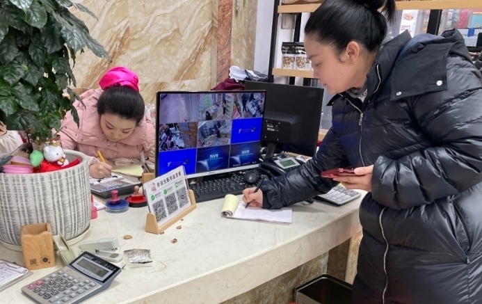 這是湖南長沙高橋大市場堅(jiān)果經(jīng)銷商李海麗(右一)在聯(lián)系物流。新華社記者 余春生 攝