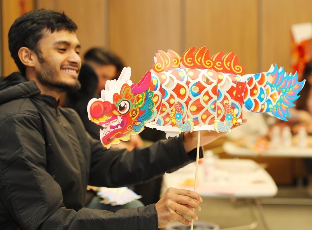 ?2月23日,在山東自貿(mào)試驗(yàn)區(qū)青島片區(qū),外國留學(xué)生拼裝龍形花燈。新華社發(fā)(張進(jìn)剛攝)