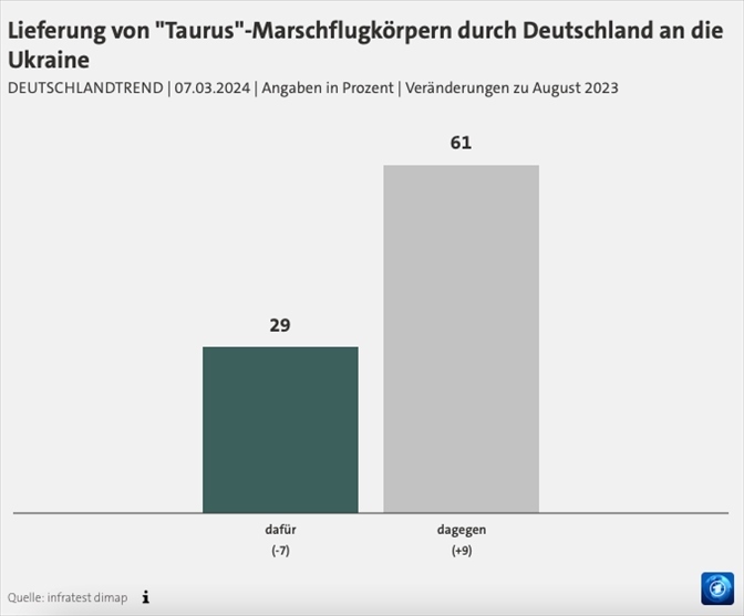 根據(jù)德國電視一臺當?shù)貢r間7日公布的最新“德國趨勢”民調(diào),在“竊聽門”事件發(fā)生后,61%的德國民眾反對向烏克蘭提供“金牛座”巡航導(dǎo)彈,較去年8月的民調(diào)結(jié)果增長了9%;支持的民眾數(shù)量減少了7%,占比僅為29%。民調(diào)還顯示,70%的受訪者擔心間諜活動增加,67%的人擔心德國對此缺乏準備,還有62%的民眾擔心德國可能會直接卷入戰(zhàn)爭。